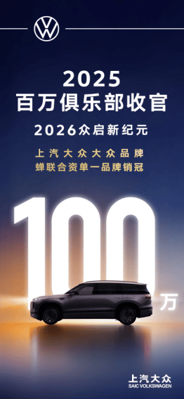近日,上汽大众2025年销量数据正式出炉,全年终端销售106万辆,其中大众品牌2025全年零售销量超100万辆,强势稳居年销“百万俱乐部”,蝉联2025年合资单一品牌销冠。