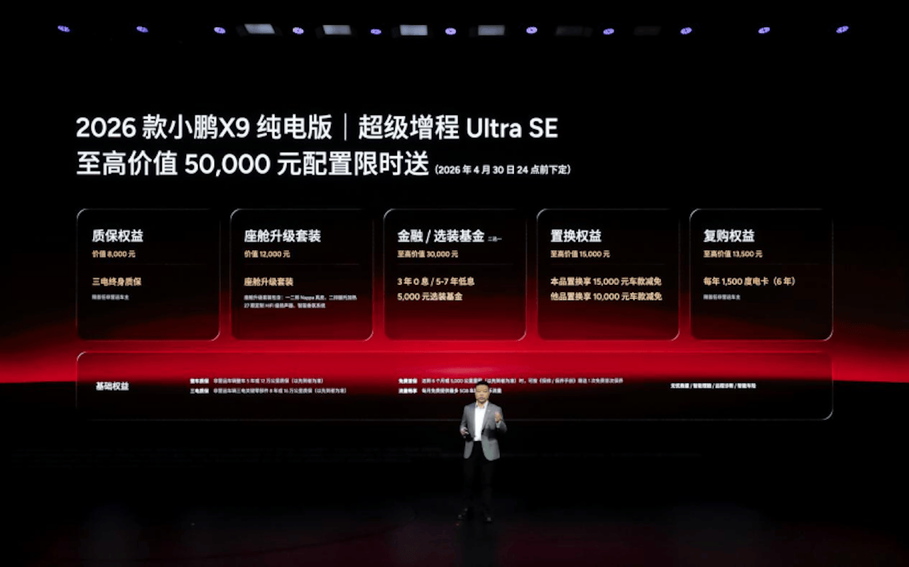 即日起至2026年4月30日24点(含)前下定2026款小鹏X9纯电版,可享最高价值50,000元 权益限时送,包含三电终身质保、价值12,000元的座舱升级套装、至高价值30,000元金融/选装基金、至高价值15,000元置换权益以及每年1500度电卡(6年)的复购权益。2026款小鹏X9超级增程权益与2026款纯电版权益一致(2026年3月31日24:00前下定),此外24和25款的小鹏X9车主置换26款小鹏X9可以获得额外1万元的代金券补贴。(2025年11月20日已发放)